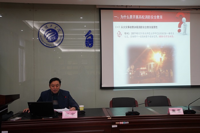 赵宏围绕“为什么开展高校消防安全教育”“消防安全常识”“火灾的预防与扑救”“火灾的疏散与逃生”等方面展开本次教育讲座。赵宏表示,部分员工消防安全意识淡薄、违反高校管理制度是火灾事故的主要原因。他通过大量数据及典型案例,强调了消防安全教育的重要性,并详细讲解了火灾发生的主要起因、火灾的预防、火灾的扑救、消防器械的使用方法及发生火灾时自救方法等知识,还就校园火灾防范的重点作了详细说明。
