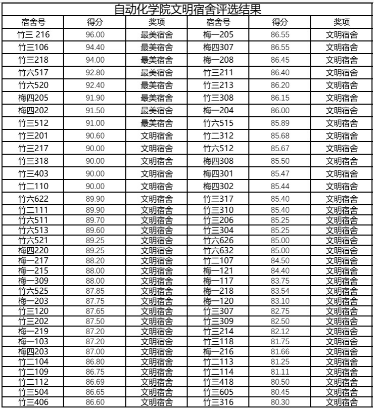 本次评比创新采用"四维考评体系",从内务管理、学风建设、安全规范、文化特色四大维度制定量化评分标准,对宿舍卫生清洁度、用电安全规范、学习氛围营造、文化墙设计等20余项指标进行全面考核。经过院员工会纪律委员会历时两周的四轮严格评审,最终68间宿舍凭借整洁的环境、浓郁的学风和独特的文化创意脱颖而出,晋级校级文明宿舍。最终获奖名单如下: