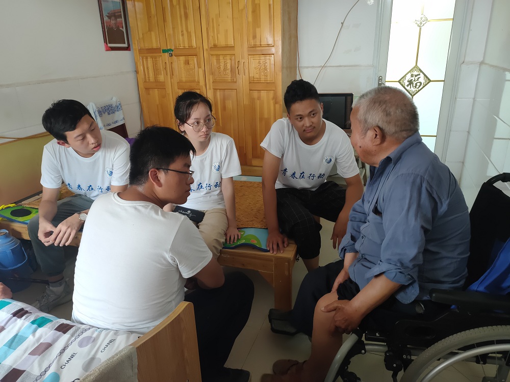 七十二岁的张大爷,因常年劳作,骨头坏死,一直坐着轮椅,他一直向志愿者们讲述自己身边的事情,在聊到他的双腿的时候,志愿者们眼眶的泪水在打转,但是他乐观积极的生活态度感染着每一位成员……