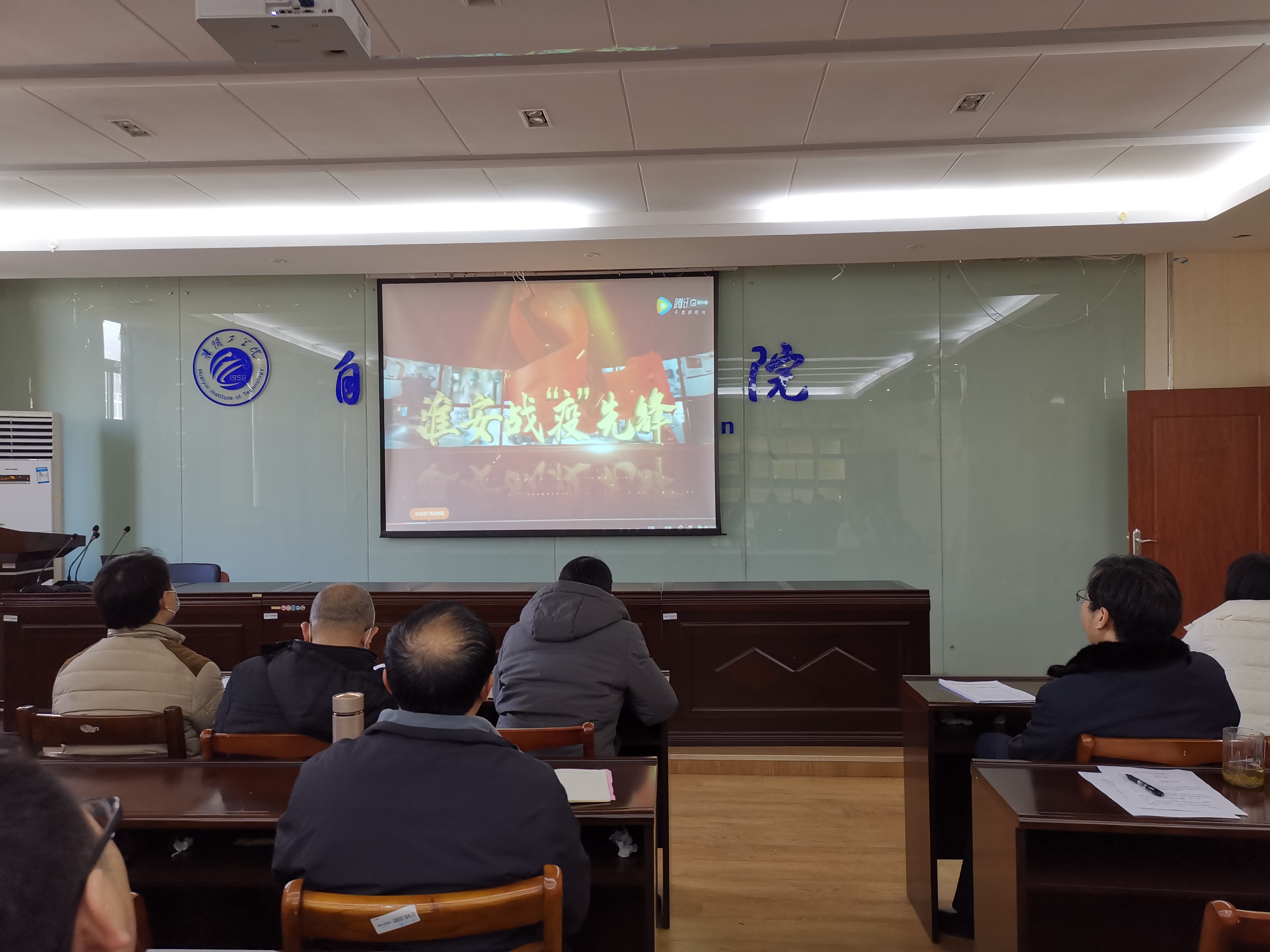 公司党委书记施坚领学习近平在省部级主要领导干部学习贯彻党的十九届五中全会精神专题研讨班开班式上的讲话等后,所有教师党员认真观看《淮安战“疫”先锋》专题片。
