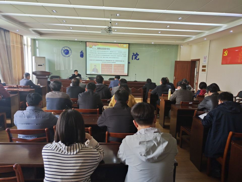 韩锦标以《中国共产党百年奋斗历程与经验启示》为题,从重要论述及重大意义、主题主线及奋斗历程、主流本质及经验启示三个方面对中国共产党的百年奋斗历程与经验启示展开阐释。为完成争取民族独立、人民解放和实现国家富强、人民幸福两大历史任务,中国共产党始终牢记为中华民族谋复兴、为中国人民谋幸福、为世界人民谋大同的初心,在新民主主义革命时期、社会主义革命和建设时期、改革开放和社会主义现代化建设新时期、中国特色社会主义进入新时代四个历史时期完成和推进了救国、兴国、富国、强国大业,铸就了中国共产党百年辉煌。中国共产党的百年历史,是党为实现民族独立、人民解放和国家繁荣富强、人民共同富裕而不懈努力奋斗的历史;是党坚持把马克思主义基本原理同中国实际相结合、不断推进马克思主义中国化的历史;是党加强和改进自身建设、始终保持和不断发展党的先进性纯洁性的历史。韩主任用图文并茂的讲解方式和生动形象的语言,让师生在党史的学习中,洗礼了思想,升华了精神。