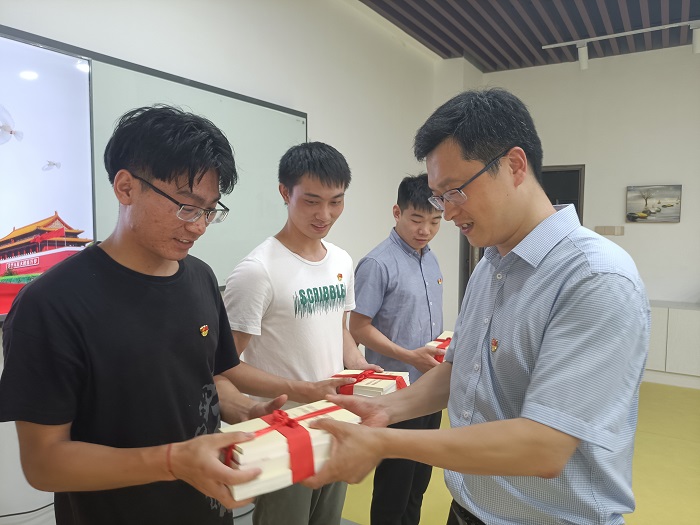 党委书记郑洋将《中国共产党简史》等4本党史学习教育必读书作为生日礼物发放给毕业生党员,并鼓励他们在毕业之后继续加强党史理论学习,时刻不忘学习“充电”,在百年党史中汲取前进力量,始终做到不忘初心、牢记使命。