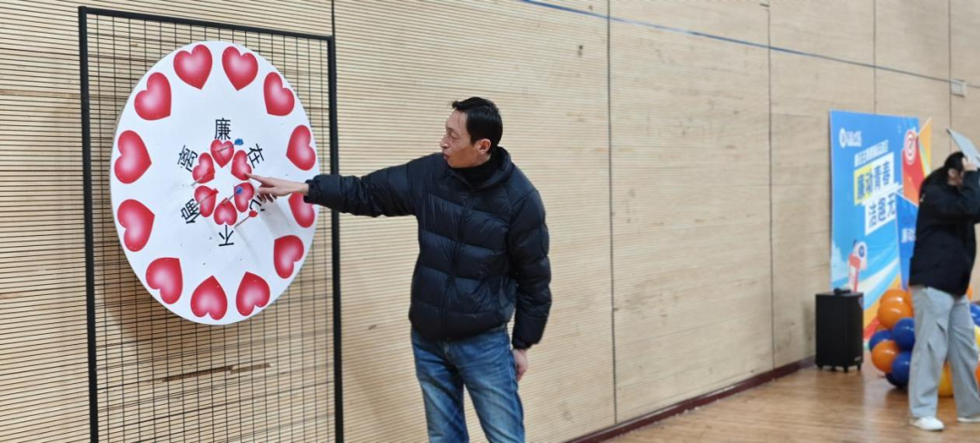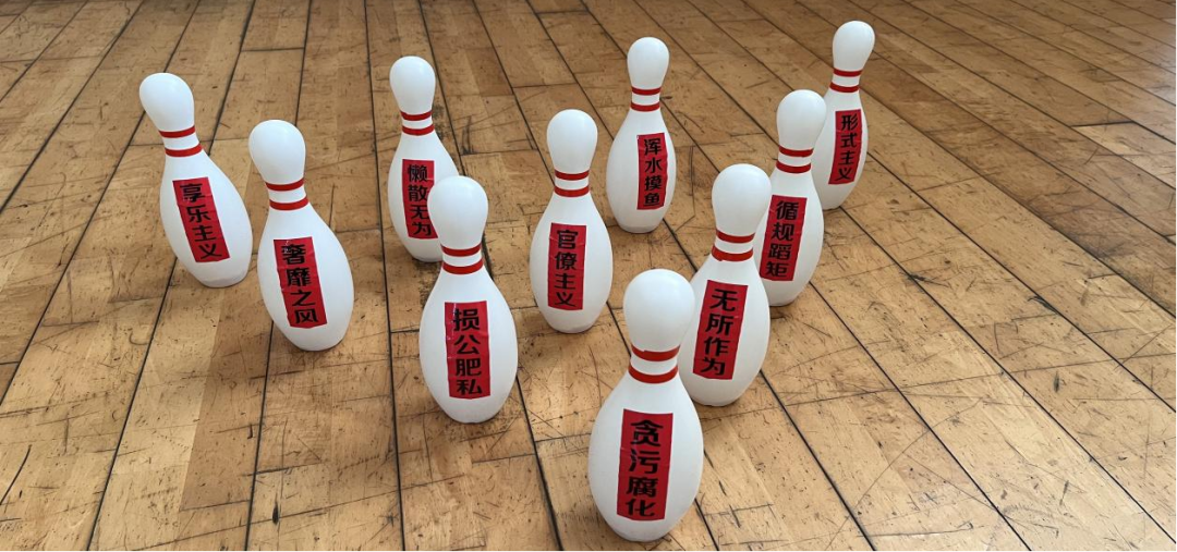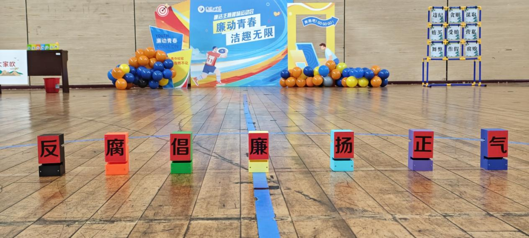 比赛现场,全体教师分别参加“廉在心 不偏离”——射飞镖、“洁守身 俭养德”——保龄球、“树底线 心向廉”——套圈圈、“清廉风 大家吹”——吹球过洞、“知廉义 击贪腐”——飞盘打靶、“走正道 响警锣”——蒙眼敲铜锣、“律修身 合群力”——合力筑塔等趣味体育项目。每位教师用飞镖掷击“歪风”表达对打击歪风邪气的坚决决心,用地滚球的方式狠狠砸向寓意着“浪费”“贪污”等“坏作风瓶”以此表达对腐败行为、坏作风的憎恶,用圈套在定点区域中的腐败目标物表达对腐败行为的痛恨,用乒乓球吹过水杯将廉洁之风吹向日常生活的各个方面,用飞盘投打“违纪”“贪赃”“舞弊”表明大家对错误行为的抵制与对廉洁品格的坚定,用铜锣洪亮响声传递对未来的警醒和期待,用齐心协力合力筑起“反腐倡廉扬正气”之塔。