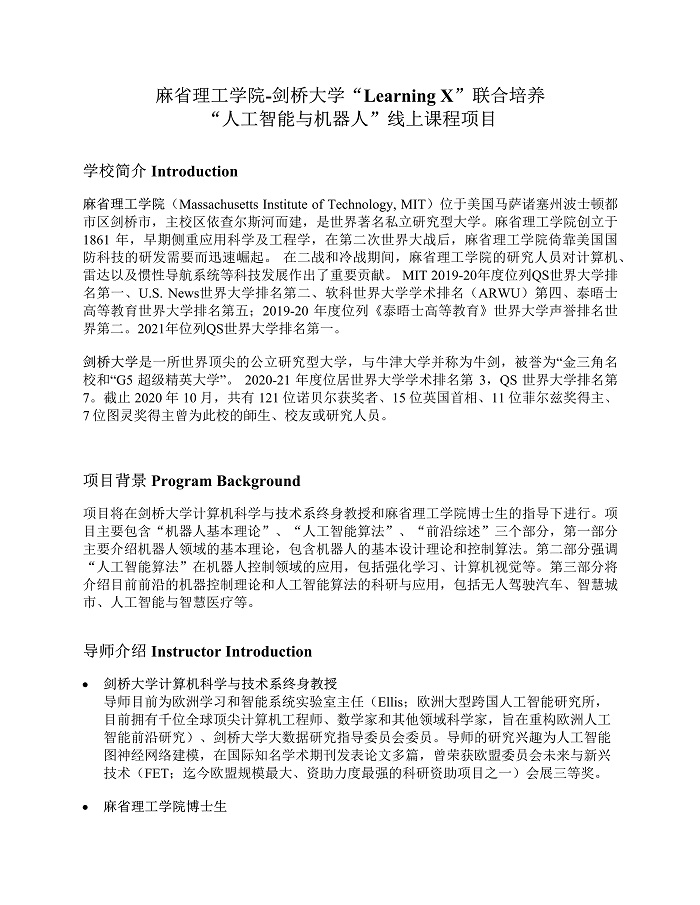麻省理工公司-剑桥大学“Learning X”联合培养“人工智能与机器人”线上课程项目