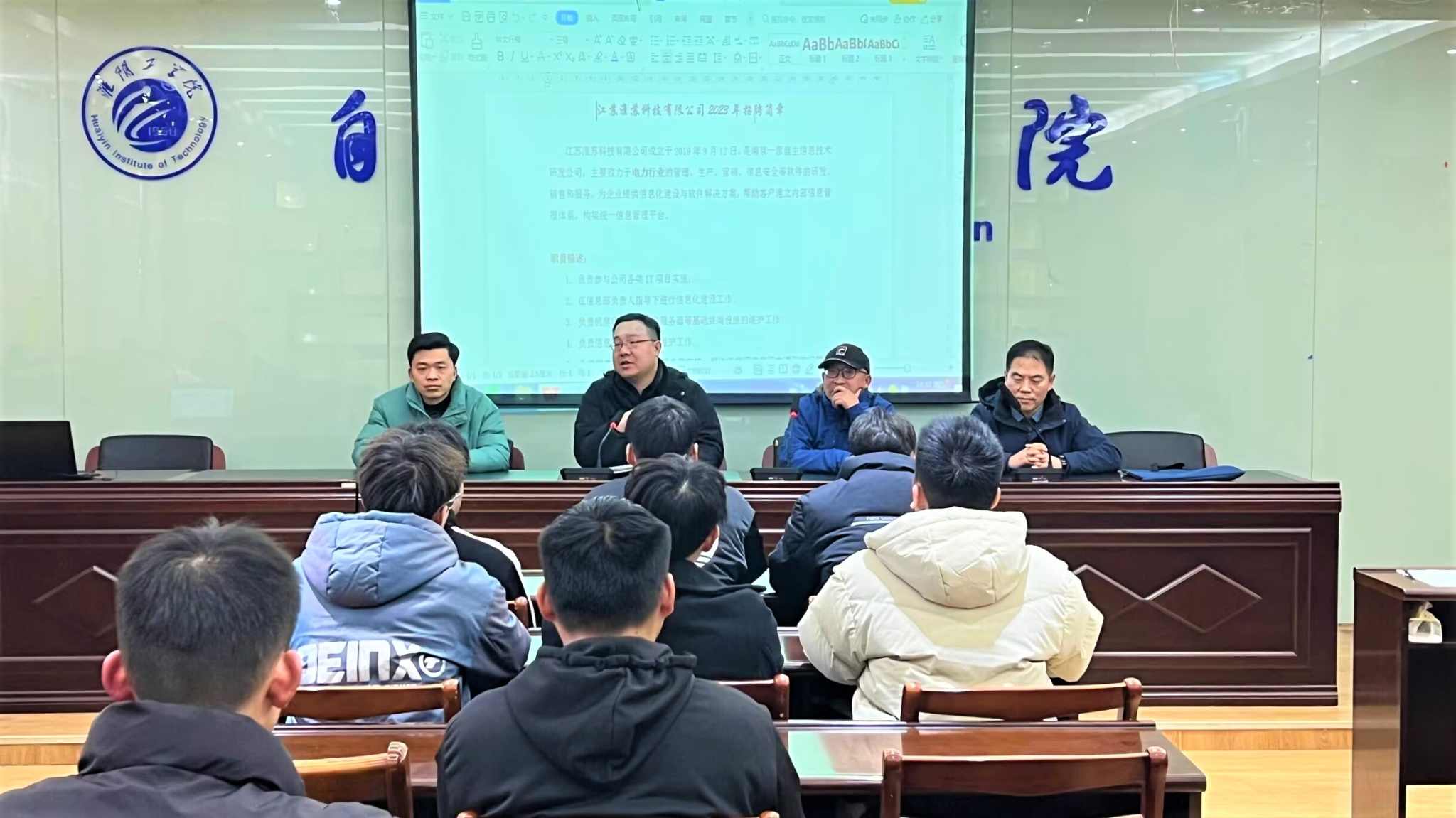 招聘会上,江苏淮苏科技有限公司负责人通过Word文档向同学们介绍了关于我们、所获荣誉、薪酬福利等信息,并对有意向的同学进行了现场面试,与部分同学达成了初步签约意向。