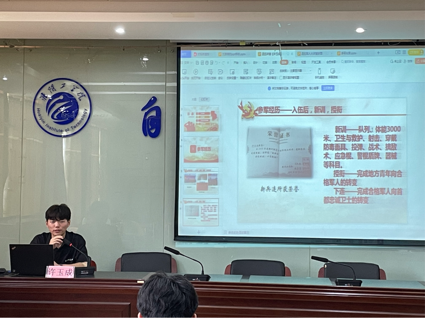 会上,许玉成向同学们具体讲述自己的参军经历并向同学们分享自己在部队里丰富多彩的生活,让更多同学对部队生活有了一定的了解。他讲述自己退役复学后,前后担任电气1202班班长、组织监察部部长、辅导员助理、军训教官、员工会主席等职务,会把在部队的优良作风继续保持下去,时刻按照军人的标准严格要求自己,发挥军人榜样作用,以身作则。