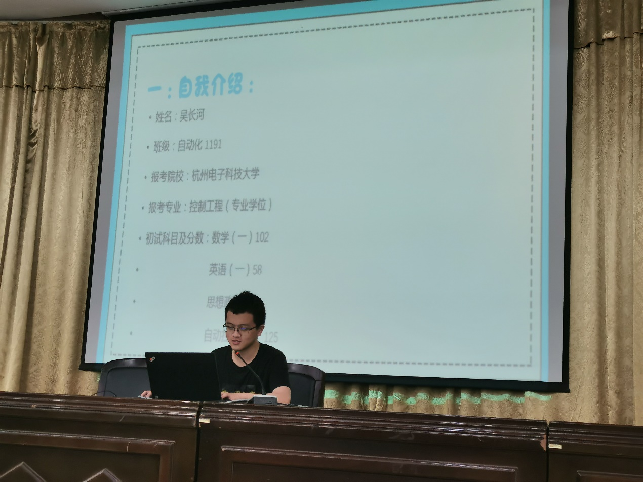 会上,XCsports2019级丁潘韬、卢国瑞、吴长河、袁泉、吴卿分别从为何考研考公、考研择校、考研复习科目、参考书目、考研心态等多方面向2020级学弟学妹们传授了自己的考研经验与学习心得,并祝愿2020级备考的学弟学妹们一战成硕,考入理想的院校。