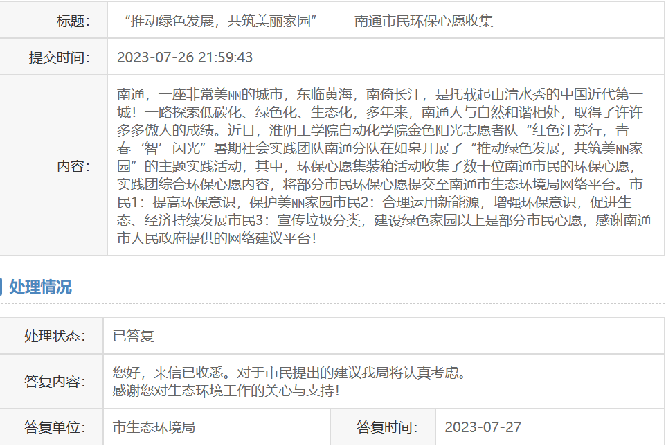 此外,实践团成员积极制作垃圾分类海报,宣传垃圾分类知识,举办了相关知识竞赛,并将所收集的环保心愿和知识竞赛情况进行整理汇总,通过在南通市人民政府网站下留言,以青春之行助力城市环保事业的发展,助力乡村振兴的推进。