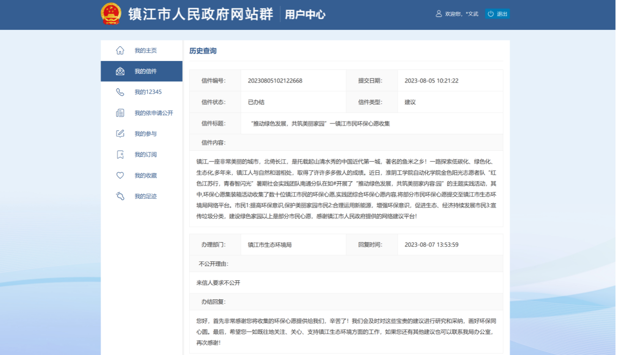 实践团成员积极制作绿色环保主题海报,宣传绿色环保,举办了相关知识竞赛,并将所收集的环保心愿和知识竞赛情况进行整理汇总,通过在镇江市人民政府网站下留言,以青春之行助力城市环保事业的发展,助力乡村振兴的推进。