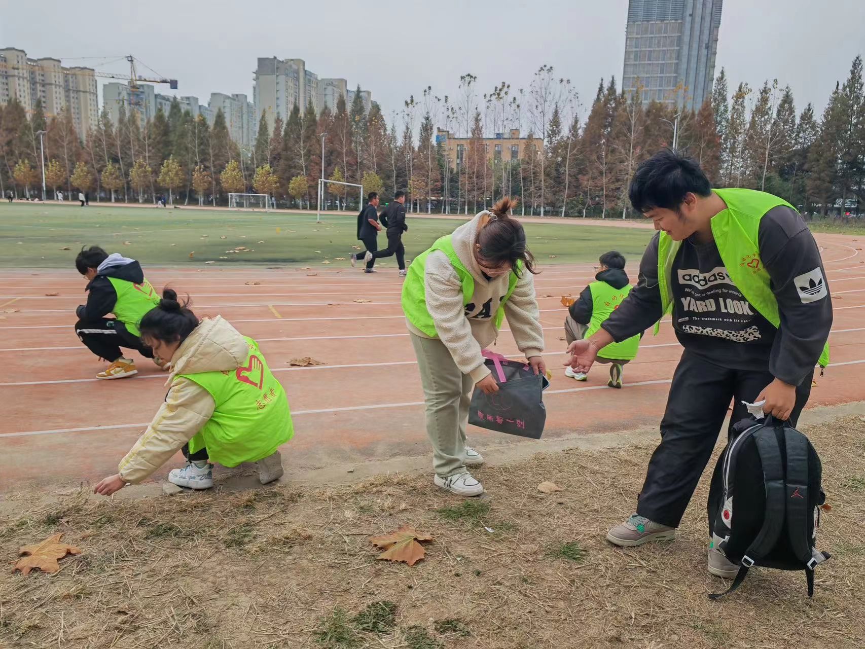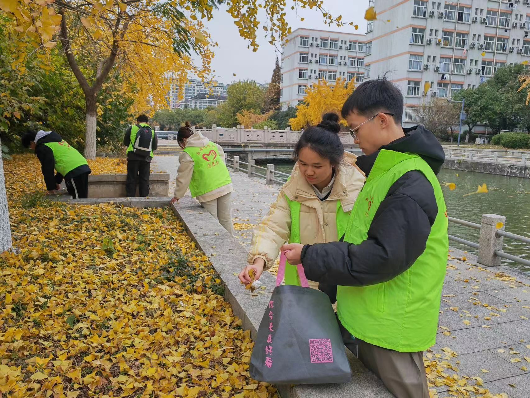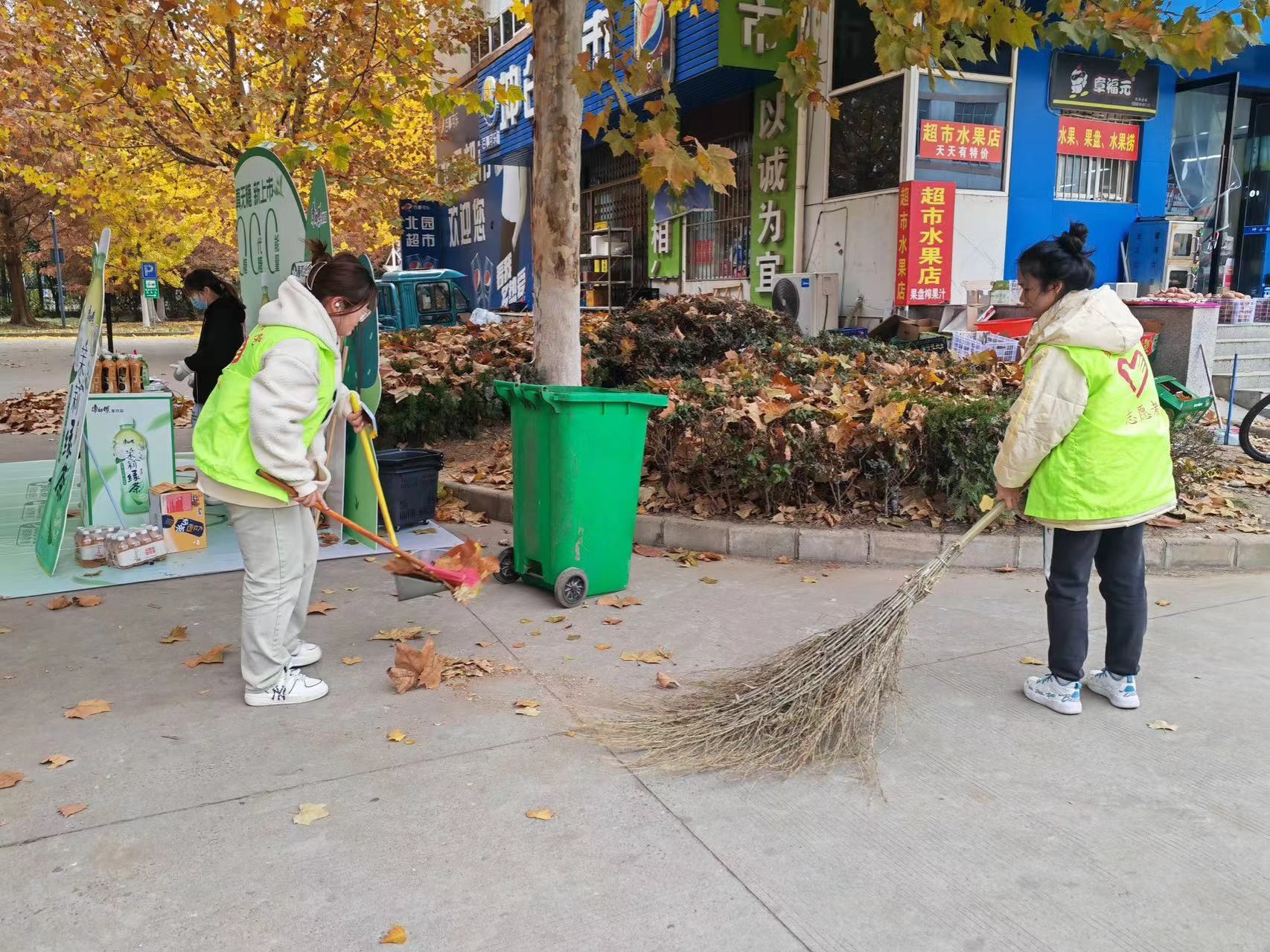 他们主动分成若干小组,按规划好的路线进行仔细打扫,大家手持扫帚、垃圾夹、塑料袋等工具,将飘落下的树叶集中、入袋、入桶,并对可回收垃圾进行分类处理。