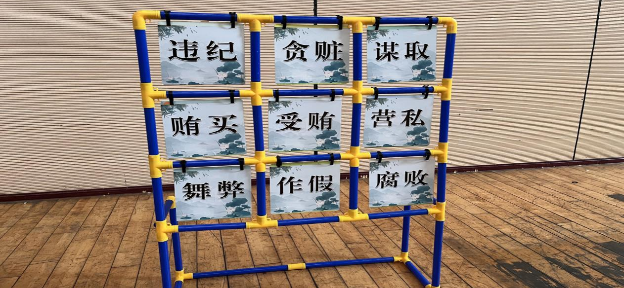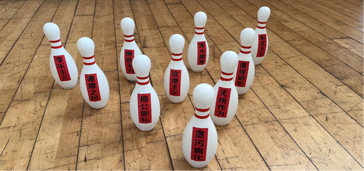 比赛现场,全体教师分别参加“廉在心 不偏离”——射飞镖、“洁守身 俭养德”——保龄球、“树底线 心向廉”——套圈圈、“清廉风 大家吹”——吹球过洞、“知廉义 击贪腐”——飞盘打靶、“走正道 响警锣”——蒙眼敲铜锣、“律修身 合群力”——合力筑塔等趣味体育项目。每位教师用飞镖掷击“歪风”表达对打击歪风邪气的坚决决心,用地滚球的方式狠狠砸向寓意着“浪费”“贪污”等“坏作风瓶”以此表达对腐败行为、坏作风的憎恶,用圈套在定点区域中的腐败目标物表达对腐败行为的痛恨,用乒乓球吹过水杯将廉洁之风吹向日常生活的各个方面,用飞盘投打“违纪”“贪赃”“舞弊”表明大家对错误行为的抵制与对廉洁品格的坚定,用铜锣洪亮响声传递对未来的警醒和期待,用齐心协力合力筑起“反腐倡廉扬正气”之塔。