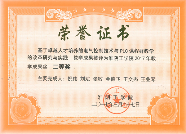 团队成员获校青年教师大奖赛二等奖1项,主持电气控制技术与PLC校精品课程,电机与拖动、过程控制及自动化仪表校优秀课程建设,以及DCS与现场总线案例库建设,其中,电气控制技术与PLC课件获第十一届全国多媒体课件大赛高教工科组二等奖、电机与拖动课件获江苏省高校优秀多媒体课件二等奖。承担各级各类教研教改项目5项,发表教研教改论文12篇,获校公司产品成果二等奖1项、省公司产品成果二等奖2项,主编、参编教材各1部。近三年团队指导员工获省级以上老员工创新实践训练计划3项,“西门子杯”中国智能制造挑战赛二、三等奖各1项,华东赛区特等奖4项、一等奖4项、二等奖1项。